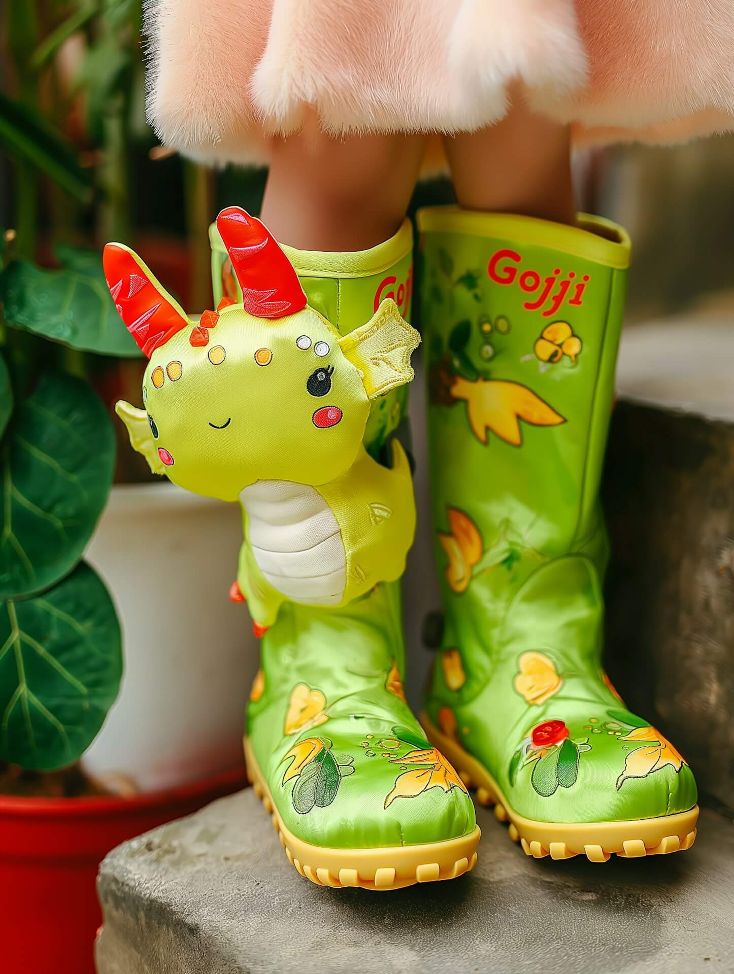 Bright green rubber boots decorated with floral motifs and insects. On one leg stands a cheerful, bright yellow plush dinosaur toy with red horns and a whimsical expression. The bright colors and playful design of the boots and toy suggest the theme of youthful joy and outdoor adventures.