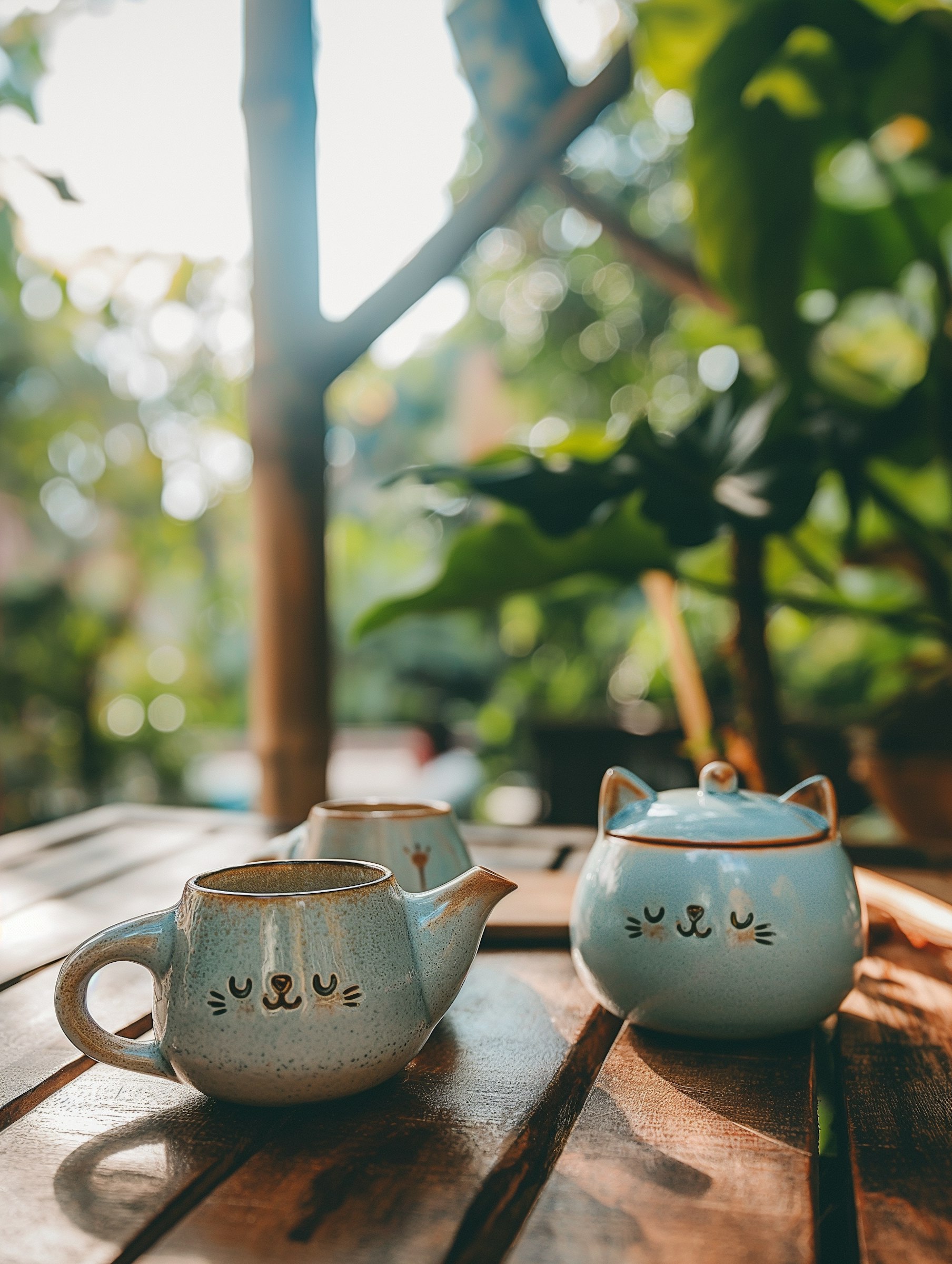 A charming and colorful collection of ceramic tea accessories, including a large teapot and smaller items resembling cats, all adorned with cheerful, cartoon-like faces. The main teapot, prominently displayed, showcases a light blue color with a cute, smiling face design.